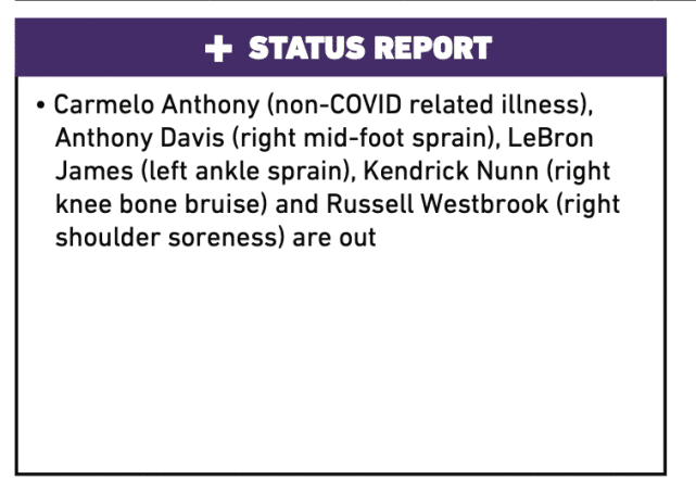 湖人官方早些时候公布伤病报告,詹姆斯、浓眉、安东尼、威少和纳恩都不会出战这场比赛,这也意味着湖人将延续上一场对阵雷霆的阵容,多位替补球员获得大量出场时间。对于他们来说,这样的比赛是证明自己的绝佳机会,能不能留在NBA,获得更好的合同,都需要拿自己的个人表现来说服球队。