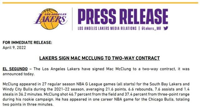 除了伤病报告,湖人官方还宣布了新的签约信息。随着加布里埃尔的双向合同被转正,湖人又腾出了一个双向合同名额,但他们也没让这个名额空缺多久。转正加布里埃尔后,湖人第一时间敲定签约麦克朗。麦克朗曾参加湖人训练营,随后在G联赛打球,本赛季他的发挥不错,当选G联赛的最佳新秀。G联赛本赛季第一次设立最佳新秀奖项,麦克朗也成为了有史以来的第一位G联赛最佳新秀。