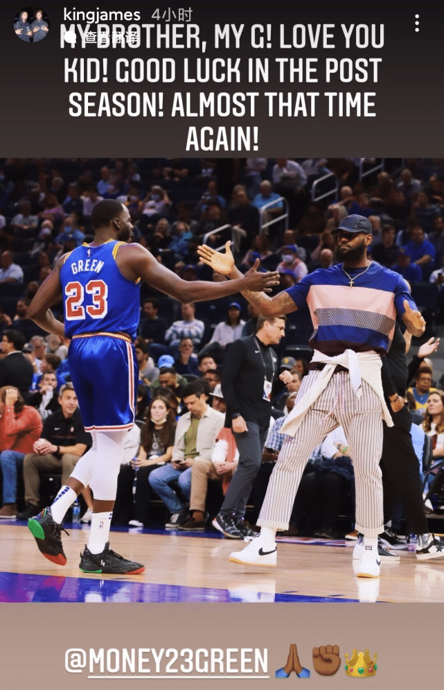 詹姆斯还在IG社媒上晒出了自己和勇士球员追梦-格林的合影,配文写道:“我的兄弟!爱你年轻人!祝你在季后赛好运,是时候再次夺冠了!”詹姆斯和追梦同属于一家经纪公司,也有生意往来,私交很好。