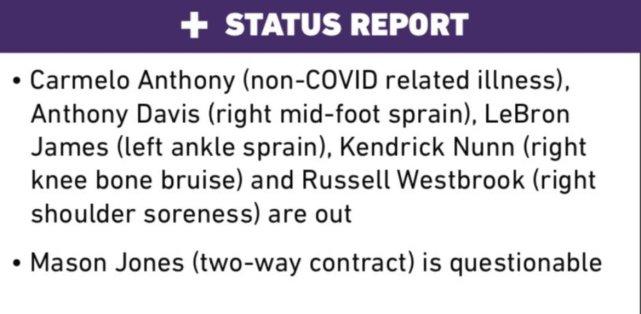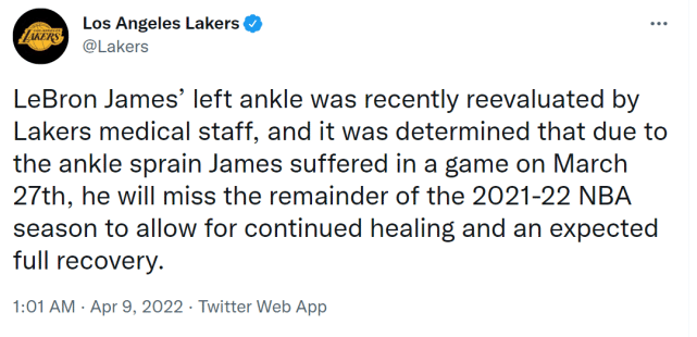 湖人官方写道:“湖人的医疗组最近对詹姆斯的左脚踝进行重新评估,鉴于他在3月28日比赛中的这次扭伤,他将缺席2021-22赛季的余下比赛,以便继续治疗和恢复。他的脚踝预计会完全康复。”自从3月28日对鹈鹕一战扭伤左脚踝后,詹姆斯缺席了湖人过去6场比赛中的5场。