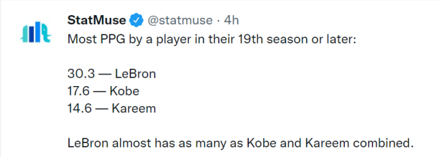 数据网站Statmuse也晒出了詹姆斯本赛季的得分表现。生涯第19赛季,詹姆斯能场均30.3分,而科比和贾巴尔同一时期的得分数据是17.6分和14.6分。Statmuse写道:“勒布朗几乎相当于科比和贾巴尔的总和。”