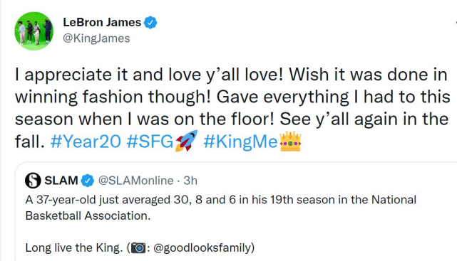 詹姆斯本人也转发自己本赛季的数据,并配文写道:“感谢你们对我的所有爱意,我本希望能以胜利的姿态结束本赛季,当我在场上时,我已经为这个赛季付出了我的一切!各位秋天再见了。#第20年 #追逐伟大 #我就是王。”
