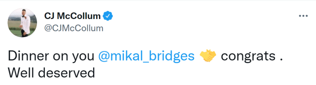 布里奇斯本人第一时间更新社媒,晒出保罗表情包,庆贺自己续约。开拓者球星麦科勒姆发文调侃布里奇斯:“吃饭你请客@布里奇斯。祝贺你,是你应得的。”