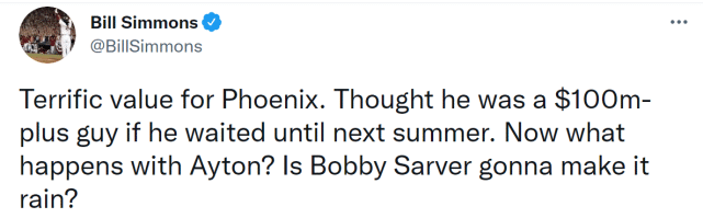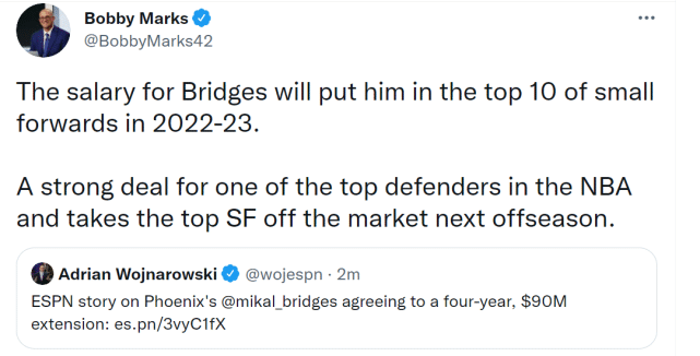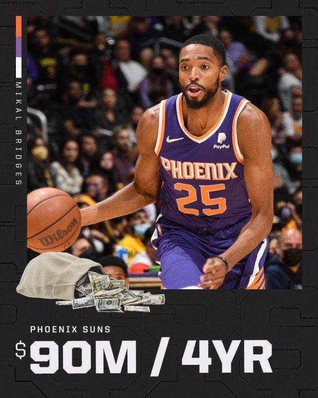 布里奇斯的这份合同,平均年薪是2250万美元,全额保障,将从2022-23赛季开始生效。薪金专家鲍比-马克斯表示,届时布里奇斯的年薪能进入联盟小前锋的前十位,这也意味着明年休赛期,球员市场上又少了一位优质小前锋。