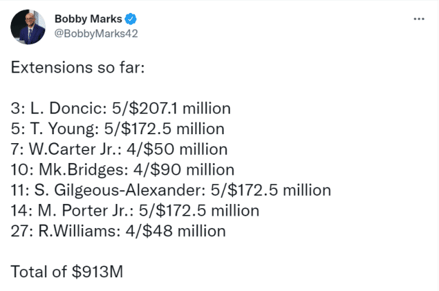 马克斯还表示,2018届的球员里,提前确定的续约金额已经达到9.13亿美元。其中包括探花秀东契奇的5年2.071亿、5号秀特雷-杨的5年1.725亿、7号秀小卡特的4年5000万、10号秀布里奇斯的4年9000万、11号秀亚历山大的5年1.725亿、14号秀小波特的5年1.725亿和27号秀罗伯特-威廉姆斯的4年4800万。