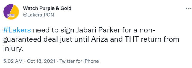 帕克效力的下一支球队是谁?已经有人建议湖人考虑他:“湖人可以用一份无保障合同签下帕克,等待阿里扎和霍顿-塔克从伤病中回归。”阿里扎和霍顿-塔克都因伤预计要缺席两个月左右的时间,湖人侧翼人手有些不足。