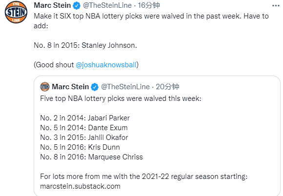 名记Marc Stein列出最近一周被球队裁掉的乐透秀——2014年榜眼贾巴里-帕克(被凯尔特人裁掉)、14年5号秀艾克萨姆(被火箭裁掉)、15年探花奥卡福(被老鹰裁掉)、15年8号秀斯坦利-约翰逊(被公牛裁掉)、16年5号秀克里斯-邓恩(被灰熊裁掉)和16年8号秀马奎斯-克里斯(被开拓者裁掉)。