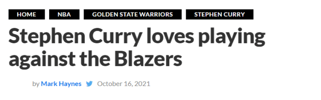 JRS直播网10月17日讯 ,美媒clutchpoint指出,波特兰开拓者可能是勇士球星库里最喜欢的对手,因为生涯数据显示,库里面对开拓者时常常会迎来爆发。季前赛最后一战,他在开拓者面前轰下41分9篮板,23投13中,三分球14投7中,罚球10罚8中。clutchpoints表示,库里自己肯定不会承认,但也许他会提前标注对开拓者比赛的日期。