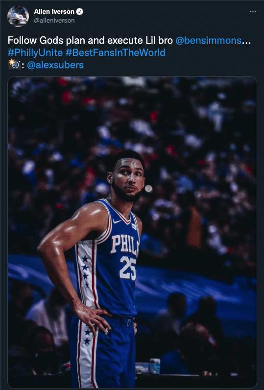 JRS直播网10月17日讯 ,76人名宿阿伦-艾弗森发声,呼吁西蒙斯继续为76人效力,艾弗森晒出西蒙斯身穿76人25号球衣的赛场照,并且配文:遵循上帝的计划并执行,小兄弟西蒙斯#世界上最好的球迷。