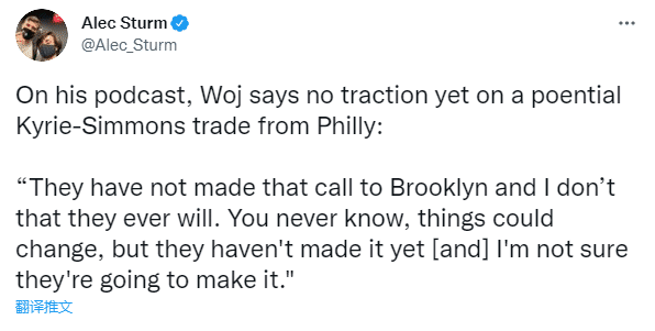 此前曾有欧文和西蒙斯互换东家的传言,对此名记沃纳罗斯基在节目中表示:76人还没有给篮网打过这个电话,事情可能会改变,但他们现在确实还没有,我也不确定他们是否会打这个电话。
