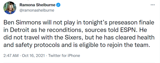 JRS直播网10月16日讯 ,据NBA记者Ramona Shelburne报道,消息人士透露,西蒙斯将缺战今日76人对阵活塞的季前赛收官战。他没有随队前往底特律,但已经通过健康安全协议,有资格回到球队中。