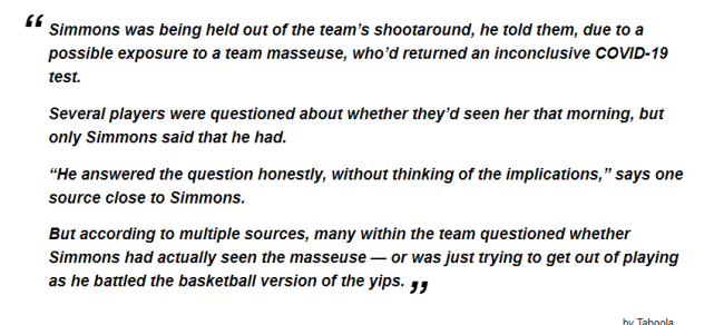 Shelburne在文中写道:“西蒙斯没有参加球队的投篮训练,因为他告诉球队,自己可能接触到了球队的一位按摩师,而之前这位按摩师的新冠检测结果是不确定的。一些球员被问及他们是否在那天上午看到那位按摩师,大家的答案都是否定的,只有西蒙斯说他见到过。”