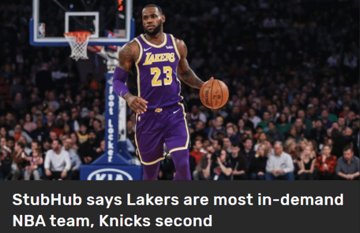 JRS直播网10月16日讯 ,据美记者Tommy Beer报道,美国票务销售网站StubHub公布了截至10月15日各支NBA球队门票的预售情况,湖人队力压篮网仍旧联盟第一,连续三年夺魁凸显紫金军团的人气和影响力。