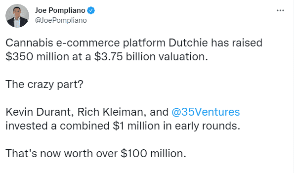 在2017年,杜兰特和里奇-克莱曼在早期投资中,总共投入了100万美元,如今这100万美元的价值已经超过1亿美元,杜兰特已经狂赚超过100倍;仅仅过了4年,杜兰特的收益足足翻了100多倍,如此投资体现出阿杜的商业头脑。