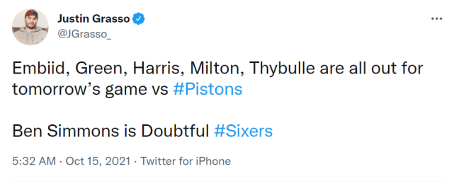 JRS直播网10月15日讯 ,据费城媒体报道,76人将本-西蒙斯出战活塞的状态列为doubtful (25%上场可能,大概率不打)。换言之,他参加76人季前赛收官战的可能性很小。与此同时,恩比德、格林、哈里斯、米尔顿、塞布尔都已经确定不会参加对活塞的比赛。