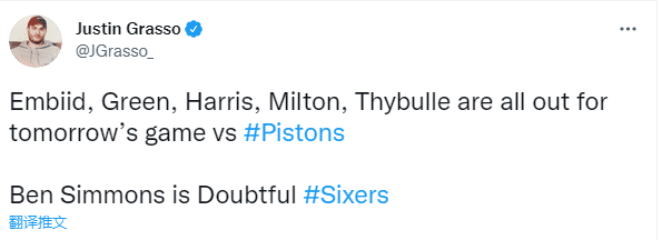 JRS直播网10月15日讯 ,费城76人官方公布季前赛对阵活塞的伤病报告,恩比德、丹尼-格林、哈里斯、米尔顿和赛布尔都将休战不打,西蒙斯的出战状态被列为出战成疑(doubtful,25%出场可能性)。