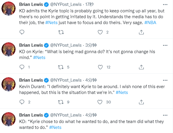 杜兰特更直言:生气能有什么用吗?这又不会改变他的想法;还表示欧文的话题可以会持续一整年,我不会生气发怒的,媒体做了他们的工作,而篮网只专注于他们的目标。