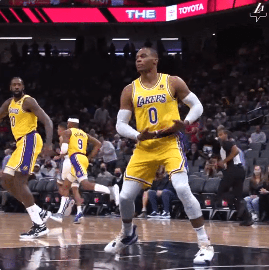 首节比赛,威少开场就突破杀到禁区得分,又在禁区接詹姆斯传球并且轻松得分,第一节出战9分钟6投3中拿到6分1篮板1助攻,威少打开心了,身披紫金0号球衣做出经典的“哄娃娃”庆祝动作,湖人官推也转发这一幕。