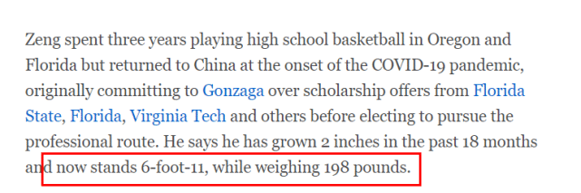 “那改变了我的一切……学会如何和其他球员成为队友以及竞争,”曾凡博说,“在高中比赛中,我防过所有位置的对手:后卫、前锋和内线的大个子。我能融入任何球队,因为我能命中空位投篮,能找到队友,也能在持球时做出正确的决定。长高2英寸,能让我跳得更高,提升我的防守和篮板。”
