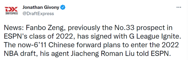 JRS直播网10月14日讯 ,据ESPN选秀专家Jonathan Givony报道,曾凡博的经纪人刘家成透露,曾凡博计划参加2022年NBA选秀。此前在ESPN的选秀预测榜上,曾凡博一度名列第33位。