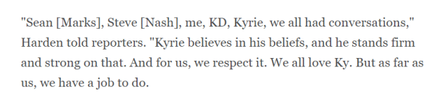 “肖恩(马克斯)、史蒂夫(纳什)、我、KD(杜兰特)、凯里(欧文),我们都进行了谈话,”哈登说,“凯里有他的信仰,而且非常坚定,我们尊重这一点,我们都爱他,”哈登说道,“但我们也有工作要做。就我个人而言,我仍然希望为自己赢下一座总冠军。整支球队,在同一条道路上。”