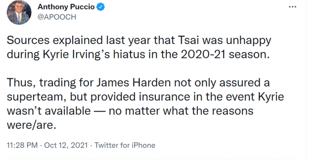 JRS直播网10月13日讯 ,篮网记者Anthony Puccio报道称,消息源透露,早在2020-21赛季,欧文因故缺席比赛时,篮网老板蔡崇信就已经不高兴了。他同意球队换来哈登,一方面是为了打造超级球队,另一方面就是为欧文准备一份保险,不管他未来因为什么原因缺席。