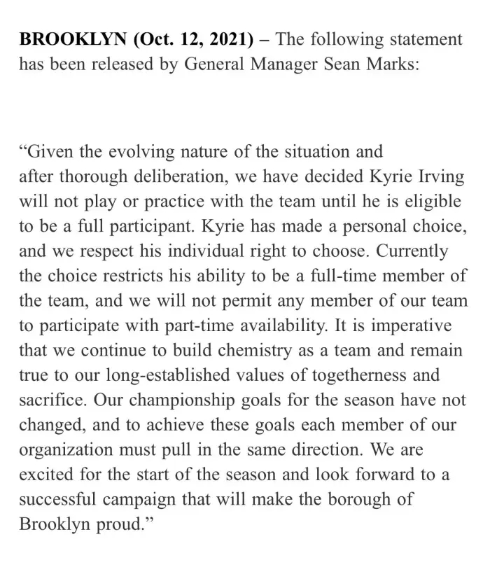 JRS直播网10月13日讯 ,篮网官宣一项决议,那就是“禁赛”欧文,而这个禁赛与我们理解的禁赛不同,这是篮网迫于无奈的决定!