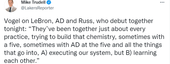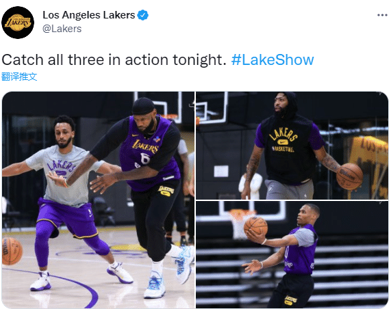湖人官推晒三巨头训练照,在今晚的比赛中观看三巨头的表现吧;沃格尔再次表示,詹姆斯、威少和浓眉三巨头今天一起出战:他们几乎每次训练都在一起,试图建立这种化学反应,执行球队的化学反应以及相互学习。不过湖人再次对阵勇士,库里和追梦格林都轮休不打。