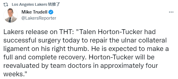 JRS直播网10月13日讯 ,洛杉矶湖人正式宣布,塔伦-霍顿-塔克已经成功接受修复右手拇指的尺侧副韧带的手术,预计他会完全康复,霍顿-塔克将在四个星期后重新接受队医的评估。