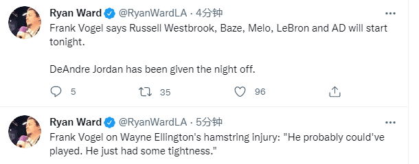 此前湖人已经遭遇四连败,比连败更扎心的是队内伤病不断,新赛季还没正式开始就有五名球员受伤,对于艾灵顿的伤势,沃格尔表示:本来艾灵顿有可能参加本场比赛的,他的腿筋只是有点进紧张;艾灵顿伤势应该无大碍,出于谨慎考虑才让他休战。