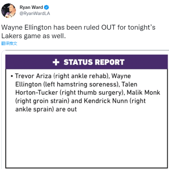 JRS直播网10月13日讯 ,湖人对阵勇士的伤情再次更新,除了阿里扎(右脚踝手术)、霍顿-塔克(右手拇指韧带撕裂)、蒙克(腹股沟拉伤)和纳恩(右脚踝扭伤)伤停之外,神射艾灵顿也伤了,因左腿筋酸痛而缺席比赛;三巨头首秀之夜,全队多达5名伤员真是太难了。