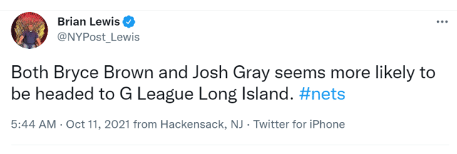 JRS直播网10月11日讯 ,篮网官方宣布,球队已经签下布莱斯-布朗和约什-格雷,裁掉了此前交易得到的萨姆纳。此前,纳什确认篮网已经做好准备欧文缺席全部主场比赛,而他们新签的两名球员都是后卫。如果欧文不能打主场比赛,篮网确实需要增加这个位置上的后备力量。