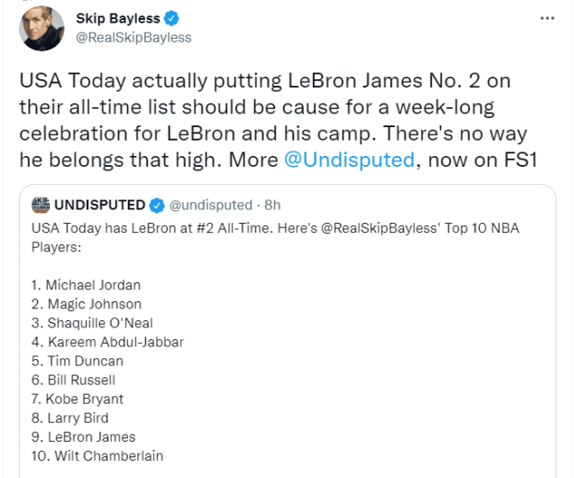 JRS直播网10月09日讯 ,NBA知名评论员斯基普-贝勒斯在节目上谈论《今日美国》的75大巨星排名。《今日美国》将詹姆斯排在历史第二,仅次于乔丹,而贝勒斯公布了自己心中的前十排名,詹姆斯竟然只被他放在第九。