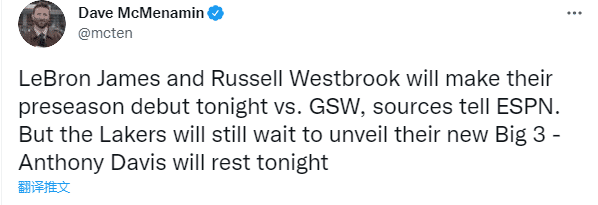 JRS直播网10月09日讯 ,湖人两大巨头詹姆斯和威少确定出战勇士,湖人记者Dave McMenamin他俩都会参加今天的比赛;此前詹姆斯和威少已经连续轮休两场,而今天湖人对阵勇士,詹姆斯将迎来湖人6号生涯首秀,威少则是迎来紫金生涯首秀,但浓眉轮休,湖人三巨头合体还需等待。