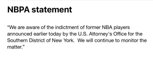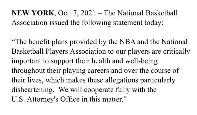 NBA官方和球员工会都已经发表声明,正式回应此事。NBA官方写道:“NBA和球员工会为我们的球员提供的福利计划,在他们的职业生涯和生活中对他们的健康和幸福至关重要,这使得这些指控尤其令人沮丧,在这个问题上,我们将全力配合联邦检察官办公室。”NBA球员工会写道:“我们今天早些时候得知了检察官办公室宣布的在纽约南区对前NBA球员们的起诉,我们将继续关注此事。”