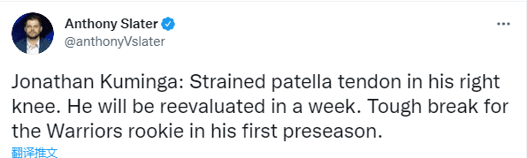 JRS直播网10月07日讯 ,勇士7号秀库明加的右膝检查结果出炉,据勇士随队记者Anthony Slater报道,库明加的伤情确诊为右膝髌骨肌腱拉伤。他将在一周内接受重新评估;勇士新秀在他的第一个季前赛中遭遇伤病太不幸了,至少伤停一周