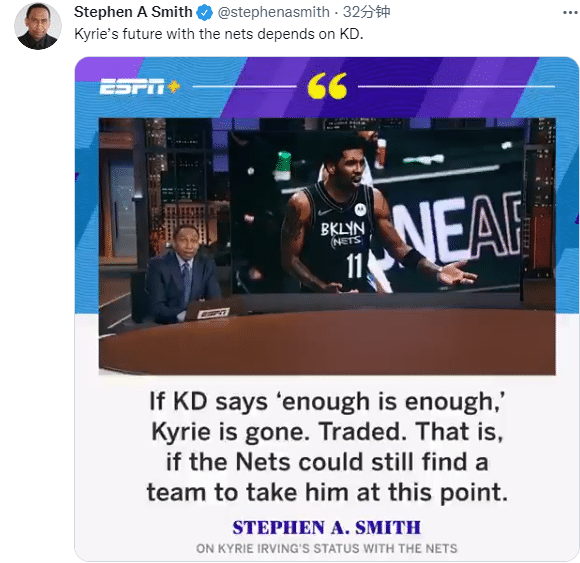 史密斯还表示杜兰特最在意篮球,关于欧文这件事的发展,取决于杜兰特而不是欧文;史密斯还发推写道:欧文在篮网的未来取决于杜兰特。
