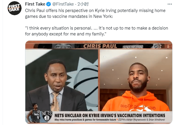 对于欧文拒绝接种疫苗的情况,太阳球星保罗表示:我认为这完全取决于个人,除了我和我的家人,我不能为任何人做出决定;保罗曾担任球员工会主席一职长达8年,今年8月份卸任,目前欧文是球员工会副主席。