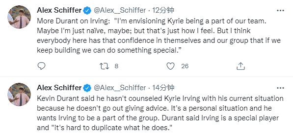 对于欧文缺席训练以及本赛季的状况,杜兰特表示:目前我没有向欧文提供建议,因为他不会去提供建议,这是个人决定,我希望凯里能成为我们球队的一部分;也许是我太天真,但这正是我的真实感受;这里的每个人都对自己和我们的团队充满信心,如果我们继续这样做,我们可以做一些特别的事情。