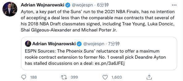 JRS直播网讯北京时间10月6日,据名记Woj报道,多位消息人士透露,太阳不愿为艾顿提供新秀顶薪续约导致续约谈判陷入僵局。
