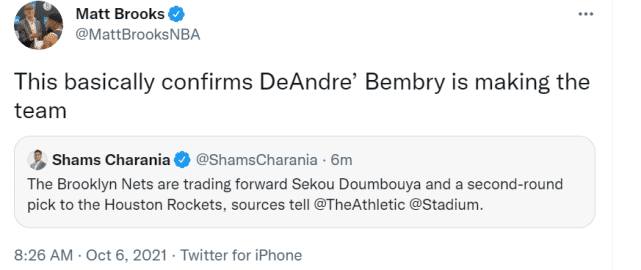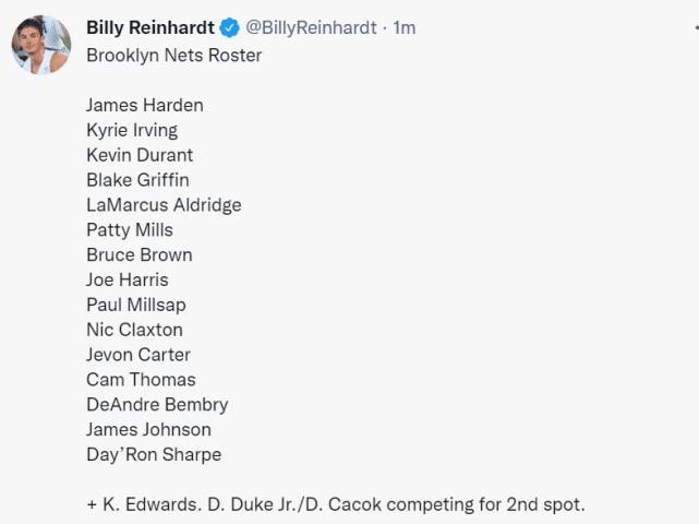 两笔交易过后,篮网记者给出了球队的现有名单:哈登、欧文、杜兰特、格里芬、阿德、米尔斯、布朗、哈里斯、米尔萨普、克拉克斯顿、卡特、托马斯、本布里、约翰逊和夏普。爱德华兹是双向,而小杜克和卡考克将竞争另一个双向合同位置。送走敦布亚也意味着本布里基本留队了。