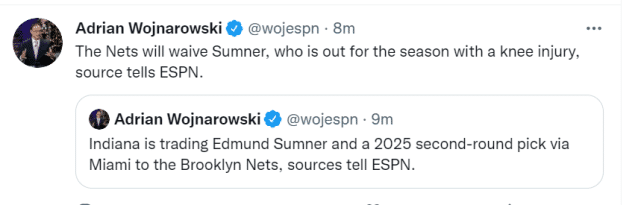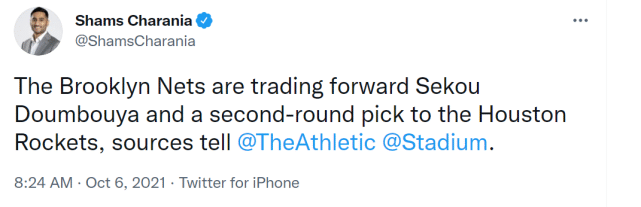 JRS直播网10月06日讯 ,据名记查拉尼亚报道,篮网和火箭达成交易协议,篮网将敦布亚和一个次轮签送往火箭。另据名记沃纳罗斯基报道,篮网还和步行者完成一笔交易,得到因膝伤报销的萨姆纳和一个2025年的次轮签,他们预计裁掉萨姆纳。