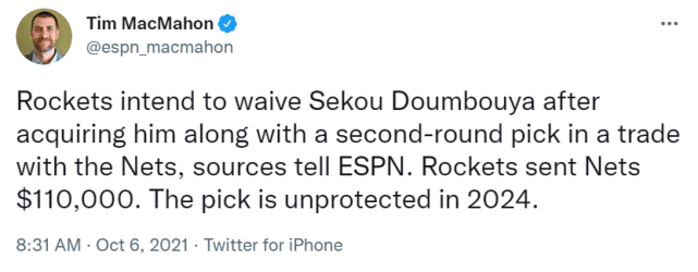 敦布亚上赛季场均5.1分2.6篮板,他在9月份的小乔丹交易中,被活塞送至篮网。对湖人的季前赛上,敦布亚获得出场机会,打了13分钟,3投3中,得到11分4篮板1助攻1抢断,后续报道称,篮网通过这笔交易省了810万美元的奢侈税和薪金,而火箭得到的是一个不受保护的2024年的次轮签,他们送给篮网11万美元现金。火箭预计会裁掉敦布亚。