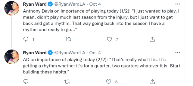 浓眉本场比赛打了11分钟,得到6分1篮板1助攻1抢断,投篮6投2中。本场比赛,詹姆斯和威少没有出战,篮网一方的三巨头也都没打。谈到自己为什么要上场时,浓眉说:“我就是想打球,上赛季由于伤病我打得不多,我想回来找找节奏。无所谓是一节还是两节,关键在于找到节奏,并开始建立这些习惯。”
