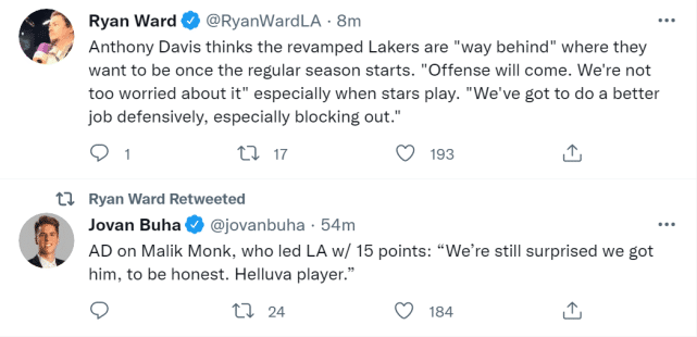 比赛是输了,但湖人还是发现了一些亮点。替补出场的蒙克贡献湖人最高的15分,其中他在47秒内连得8分的一幕,一度让全场沸腾。霍华德把蒙克称为“微波炉”,而浓眉也夸奖了他。“坦白说,能够得到他,我们依然很意外,非常棒的一名球员。”