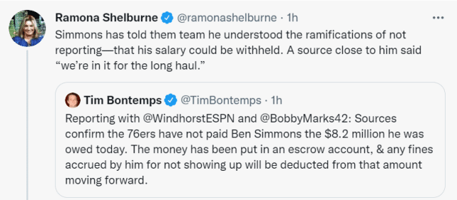 JRS直播网10月02日讯 北京时间10月2日,ESPN报道称,今天本应是76人向西蒙斯支付25%工资(825万美元)的日子,但76人没有这么做,而是把这笔钱放进了一个托管账户。未来西蒙斯的任何罚款,将先从该账户中扣除。
