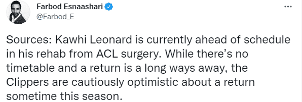 该记者Farbod Esnaashari还提到,虽然目前没有具体的回归时间表,恢复期也还有很长的一段路要走,但快船仍对他的可能复出持乐观的态度;小卡在今年7月中进行了ACL修复手术,一般情况下运动员大约在8-9个月后能恢复训练,在最理想情况下,小卡可以在3-4个月后重返训练。