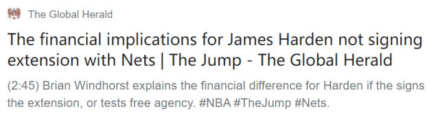 帕金斯曾是哈登雷霆时期的队友,他认同文霍斯特的说法。“哈登说这和金钱无关,但我们都知道是有关系的,”帕金斯说,“他爱篮球这项运动,但他也爱这些数字(指金钱)。多等几个月,就能多拿1.1亿美元,我不认为他会放弃这样的机会。”