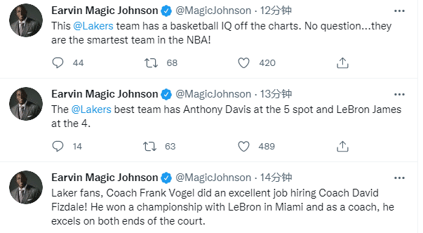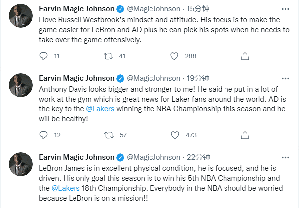 JRS直播网9月29日讯 ,湖人正式举办新赛季媒体日,詹姆斯、浓眉和威少等球员集体拍摄定妆照,三巨头正式亮相,新赛季带队冲击总冠军。对于湖人全新的冲冠阵容,湖人名宿魔术师发推说了很多话,盛赞湖人三巨头,直言湖人是全联盟最好且最聪明的球队。