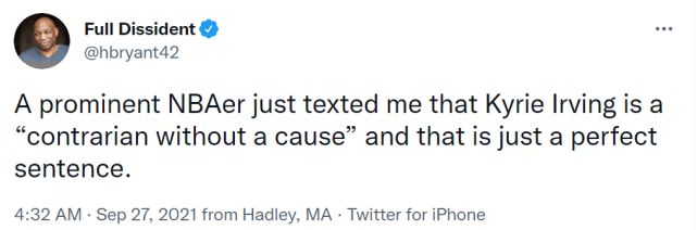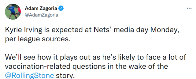 JRS直播网9月27日讯 ,据NBA记者Adam Zagoria报道,消息人士透露,篮网球星欧文预计参加明天的媒体日。此前,欧文的姑姑Tyki曾表示,她认为欧文会在媒体日上和记者们谈谈疫苗的话题。